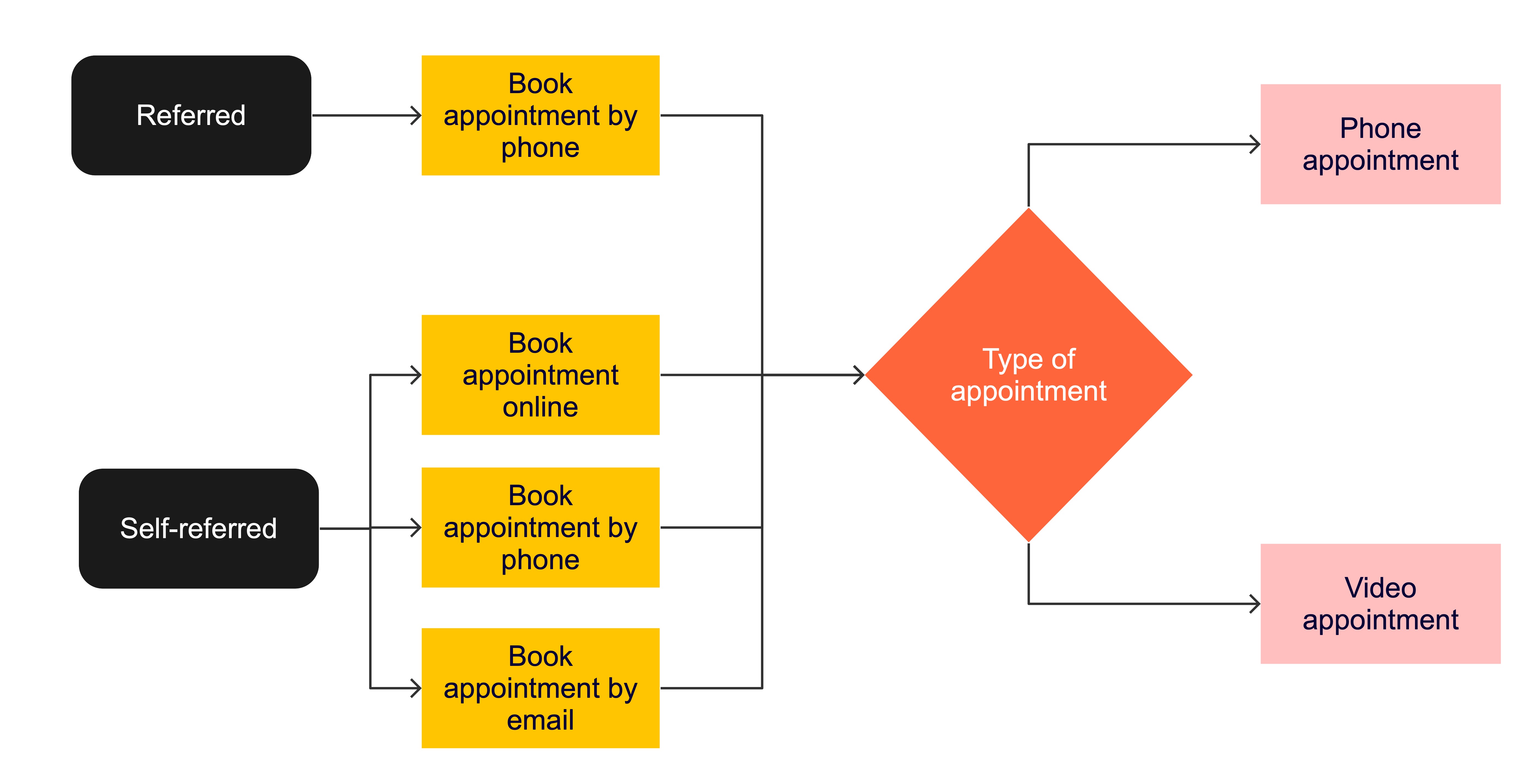 The currently offers phone appointment and video appointment supported by MS Teams. Additionally, a patient can either self-refer or be referred where there are a mix of booking methods.
