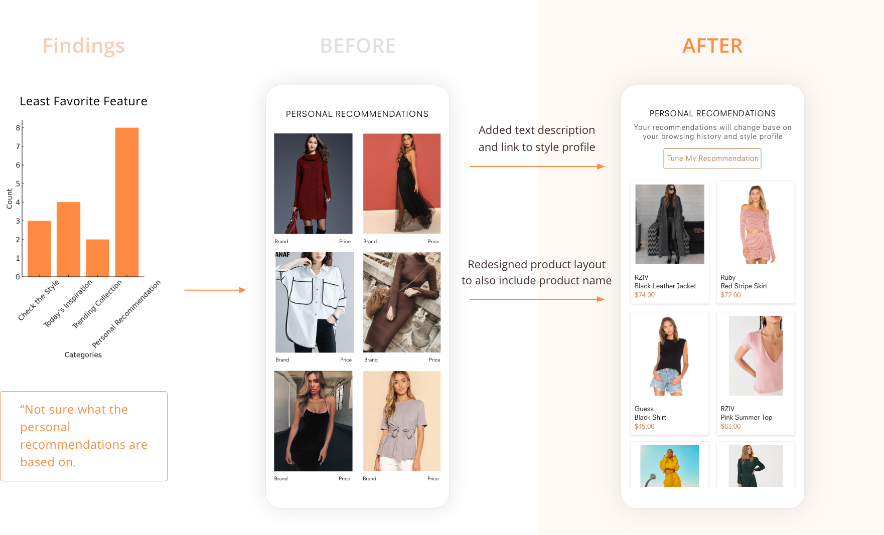 Personal recommendation received the most negative feedbacks from users. A major reason for that is the issue of discoverability in how to customize recommendations. With "Style Profile" buried deep in account, it's difficult for users to recognize how these recommendations are generated. With the new design, we implemented an actionable button directly linking to the user's "Style Profile" with a short text explaining the interaction between style profile and recommendations.